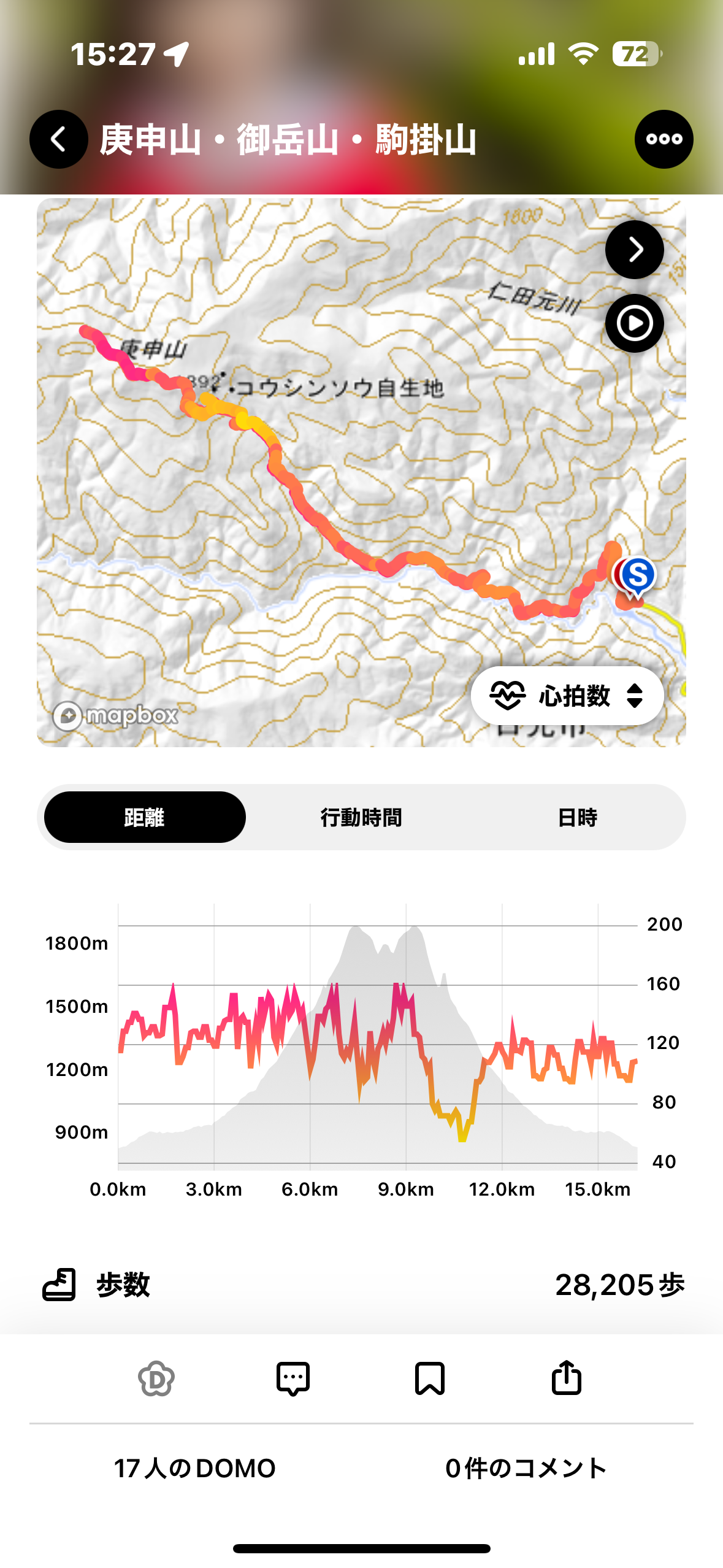 山行中、どの地点でどの程度の心拍数だったのかを逐一記録してくれます。高すぎる心拍のときは休むなどの判断材料としても使えます。